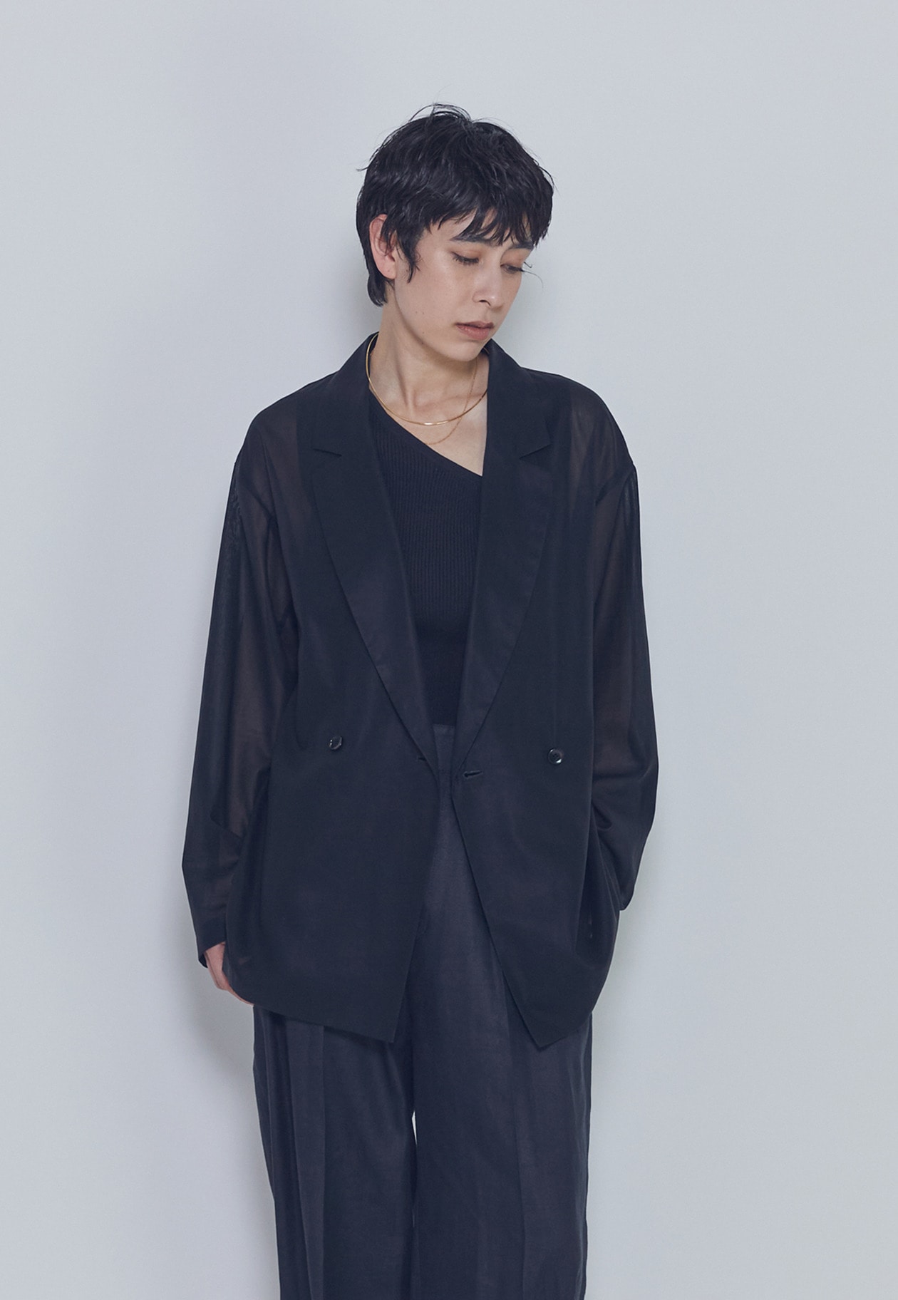 ワンショルダーのインナーやブラックデニムと合わせた、クールなスタイリングもおすすめです。