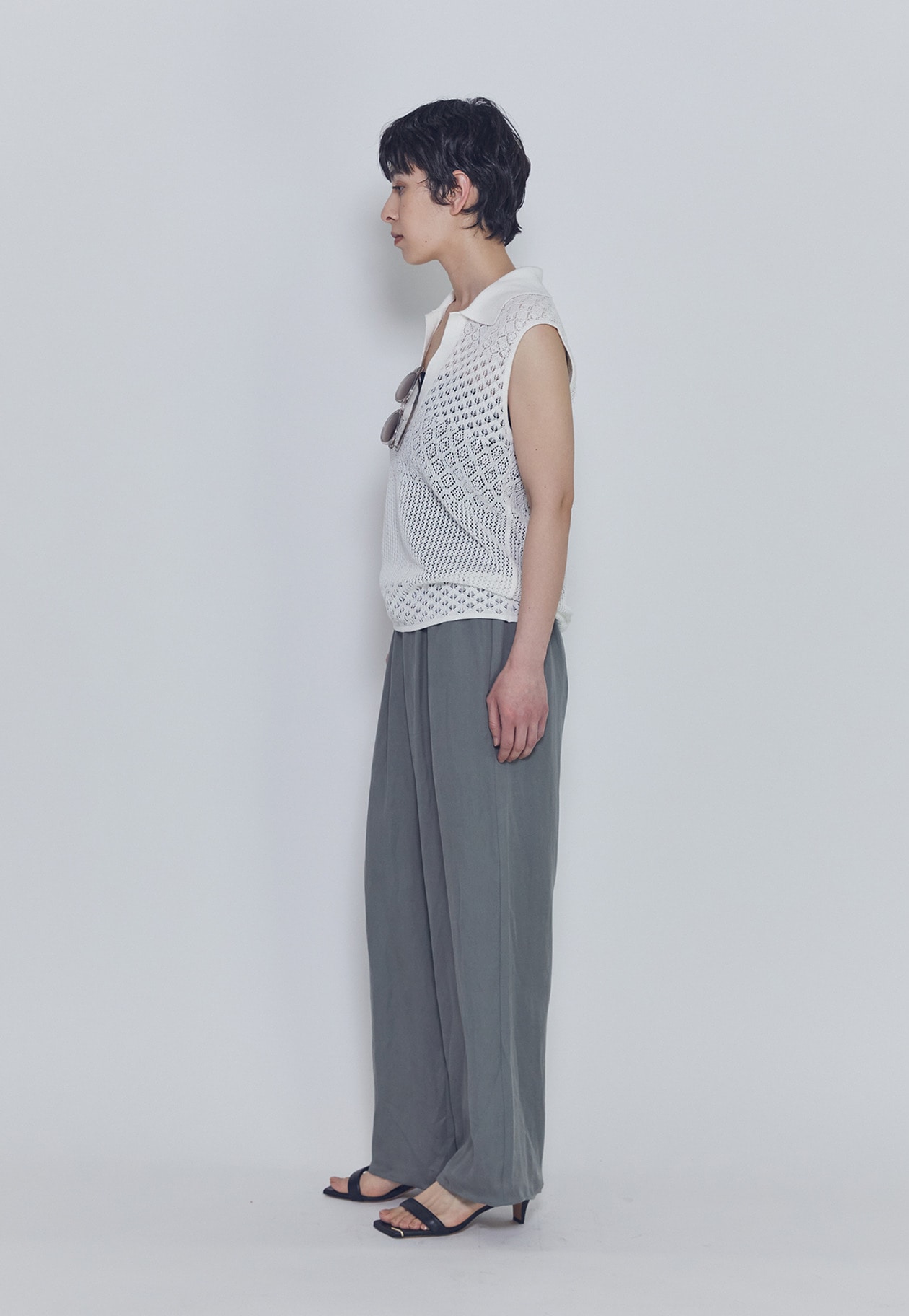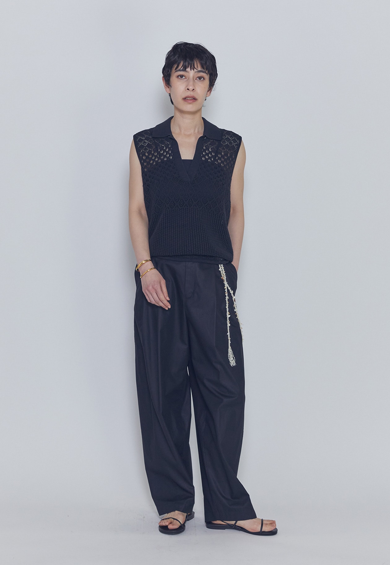 コットン糸を使用し、レースのような繊細な柄をいくつも切り替えながら編み立てたニットトップス。