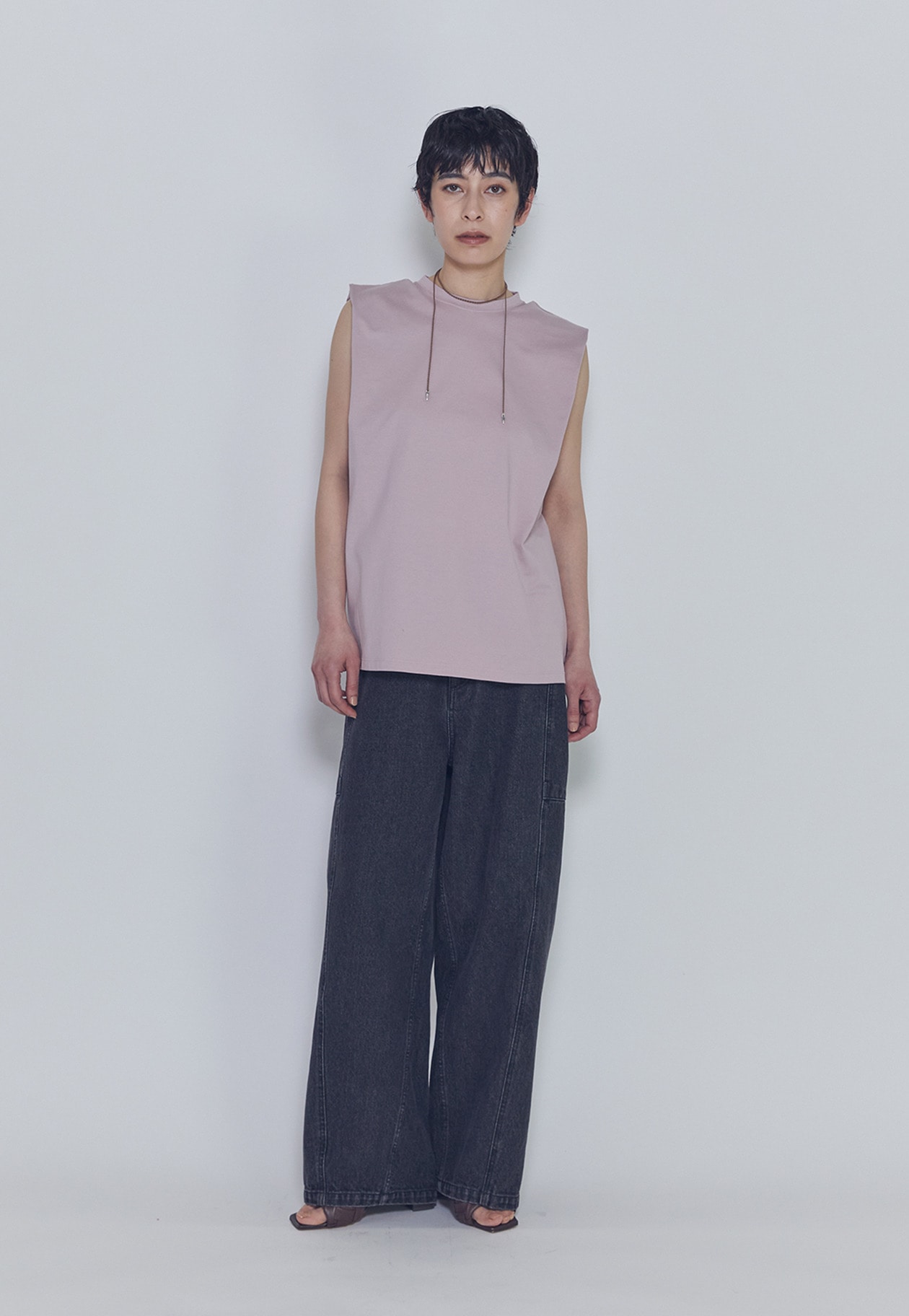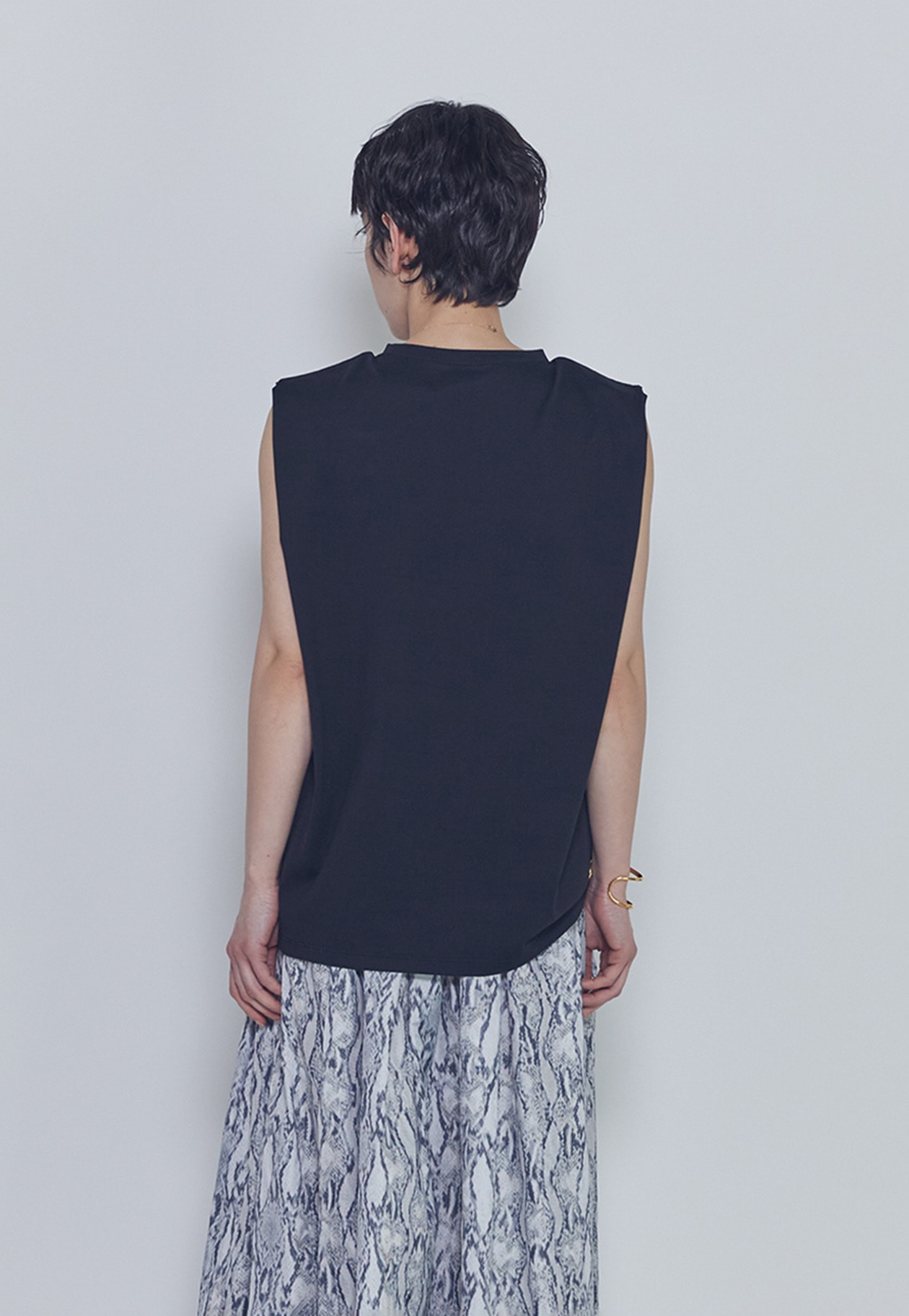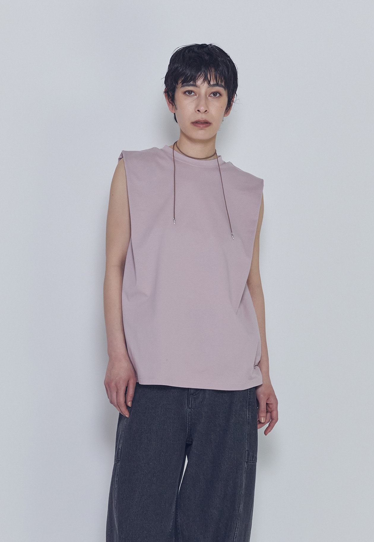 肩にタックを施したさりげないパワーショルダーデザインが、モードでカジュアルな印象を演出します。