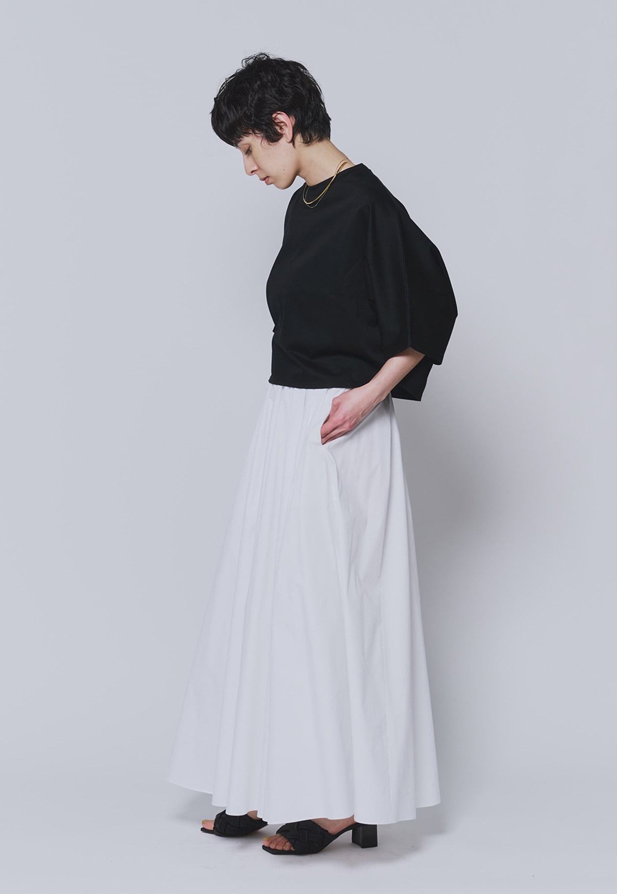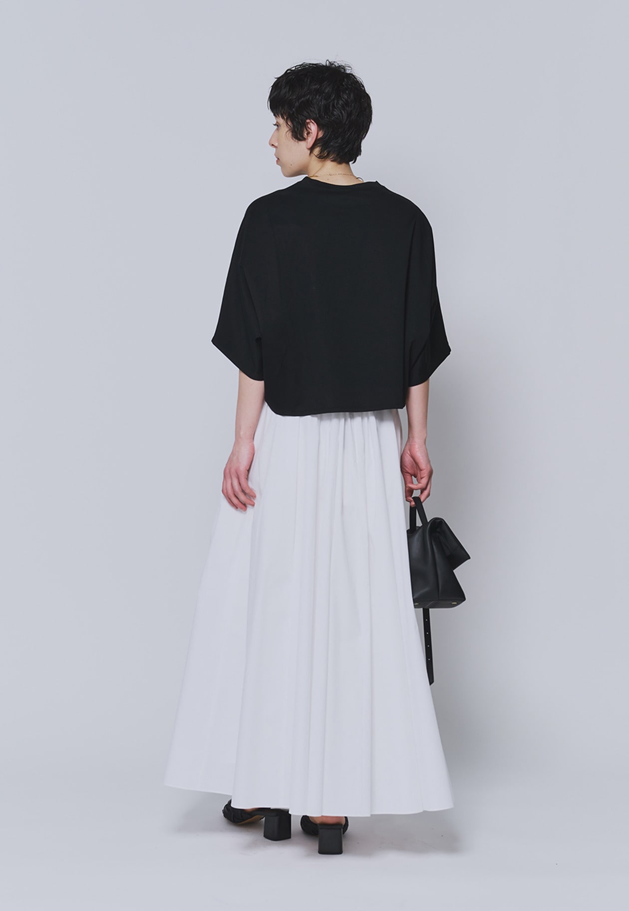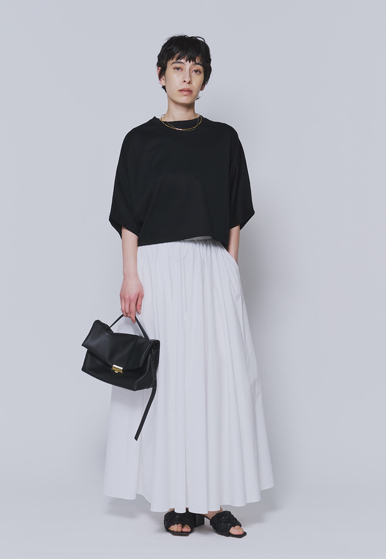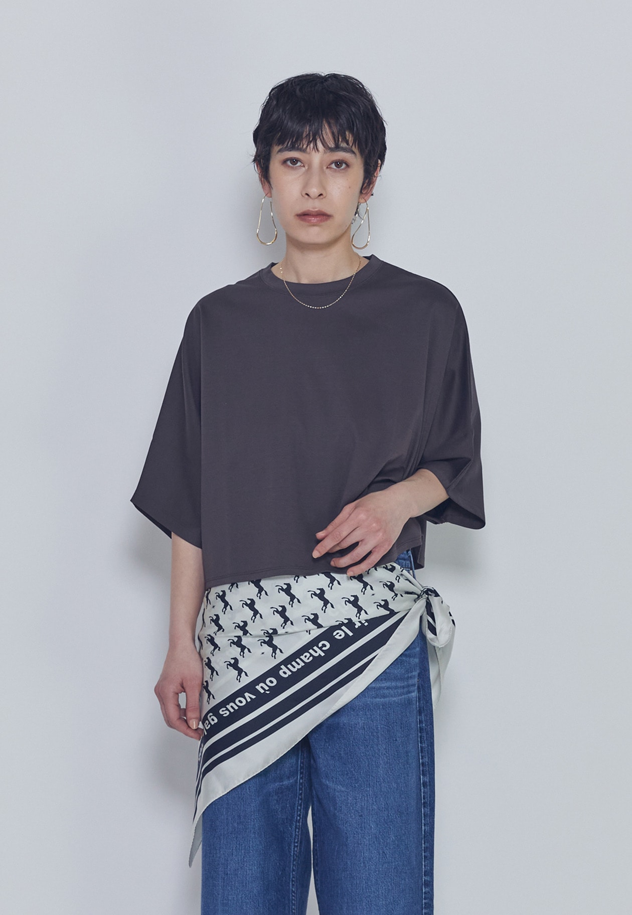 開きすぎないクルーネックとゆったりとしたドルマンスリーブ、程よいクロップド丈で、さりげないトレンド感をプラス。